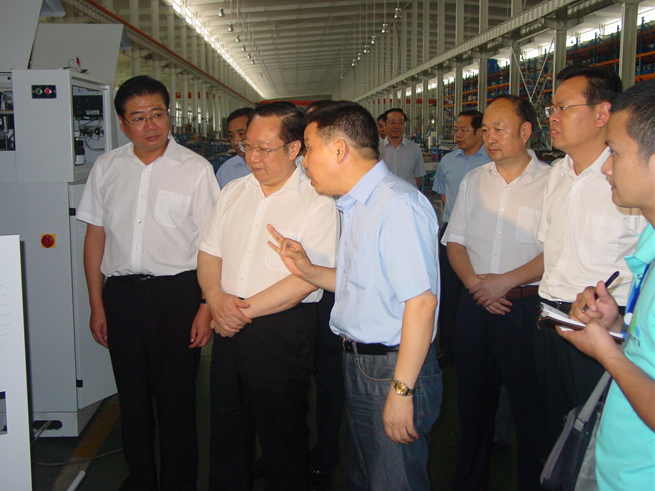 圖為王曉東(左二)在天門(mén)市委書(shū)記柯俊(左一)等市領(lǐng)導(dǎo)的陪同下,在天門(mén)紡機(jī)總裝車(chē)間視察并聽(tīng)取公司董事長(zhǎng)沈方勇(左三)工作匯報(bào)的場(chǎng)景。