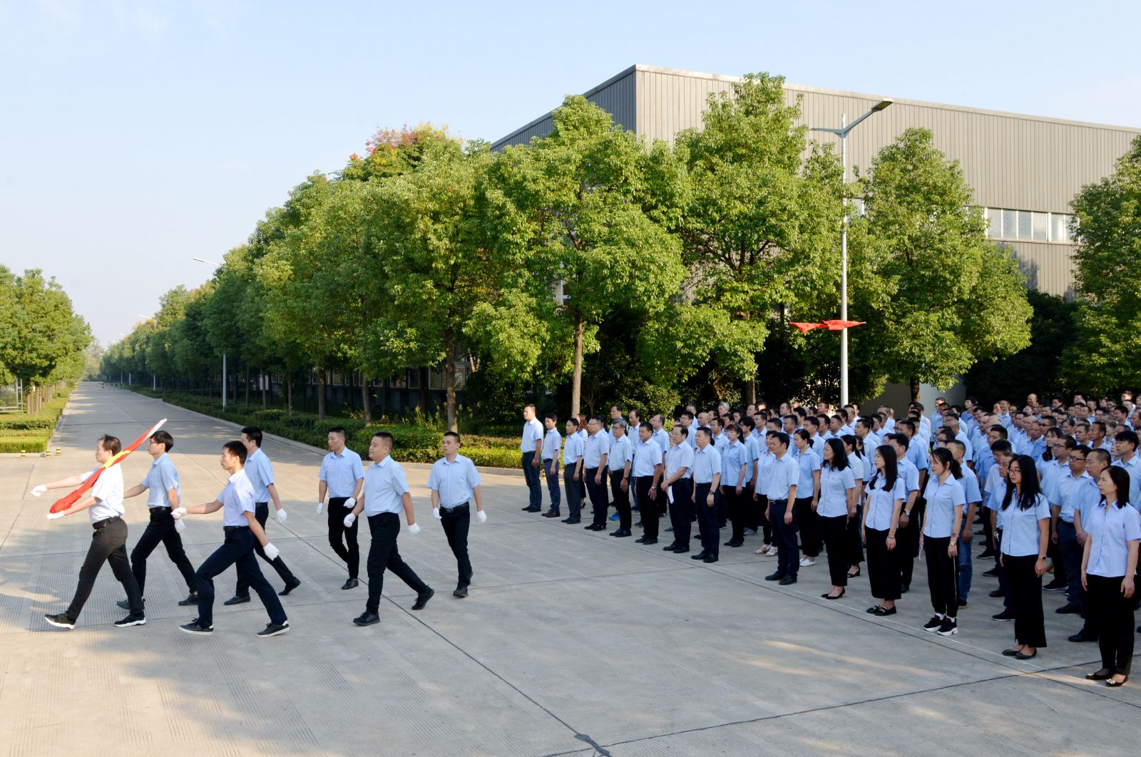 2019年9月30日早晨,一輪紅日從東方升起,給大地涂抹上一層金輝。天門紡機(jī)400多名員工在公司廣場列成方隊(duì),為即將舉行的升國旗、唱國歌活動作準(zhǔn)備。