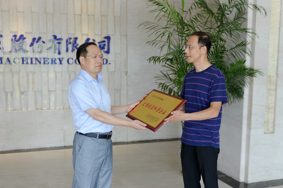 8月18日,天門市市場監(jiān)督管理局對(duì)天門紡機(jī)獲得的"文明誠信私營企業(yè) "榮譽(yù)進(jìn)行現(xiàn)場授牌,黨委書記魯?shù)挛拇砉窘优?。