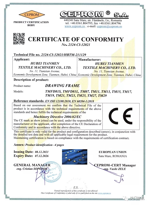 面對進入歐盟市場的機遇和挑戰,天門紡機積極探索和研究并條機出口歐盟成員國的可行性,尤其針對“CE”認證對裝備制造業提出的高標準、嚴要求,在不斷完善產品質量及安全管理基礎上,完成了大量技術文件的翻譯、整理、歸集和申報工作,公司核心產品的質量、技術水平、可靠性、穩定性、安全性已達到國際標準,更是對天門紡機品質管理、專業能力、多維度綜合實力的肯定,打造了良好的品牌形象,增強了海外市場影響力。