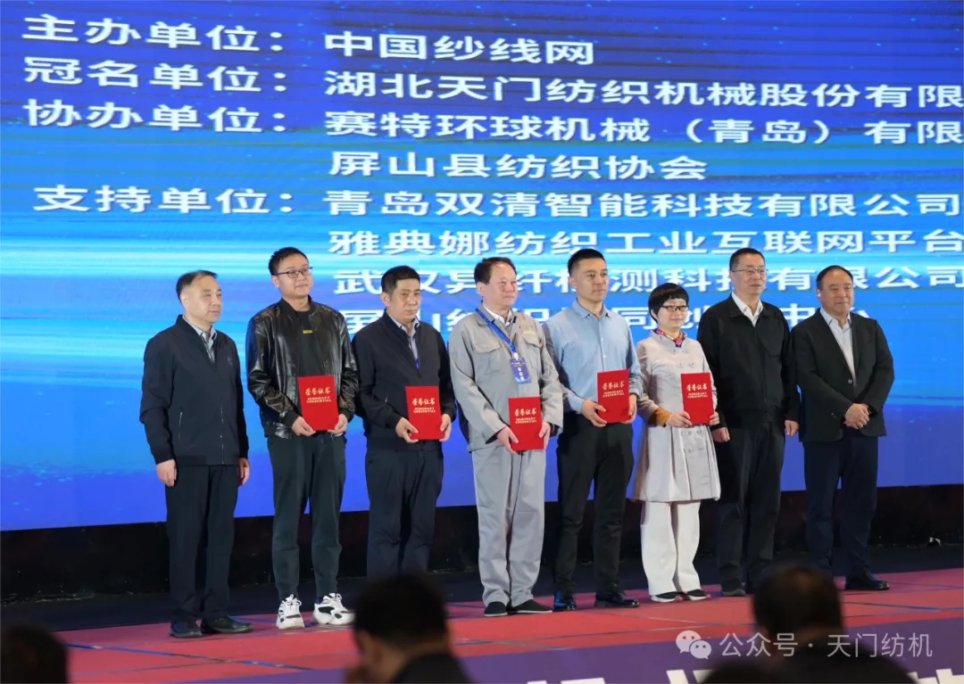 在領導和嘉賓致辭之后,舉行了“天門紡機杯”第12屆全國紡紗技術創新研討會論文頒獎活動。中國紡織機械協會會長顧平、中國紗線網總編王果剛、天門紡機總經理焦倫進為獲獎作者頒獎。
