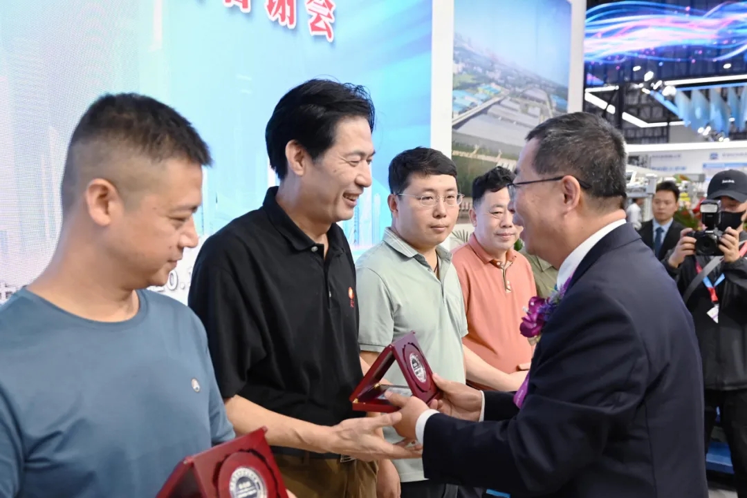 天門紡機副總經(jīng)理肖少華宣布為在并條新技術(shù)、新產(chǎn)品示范應(yīng)用上作出突出貢獻的華茂集團、魏橋紡織、魯泰紡織等45家企業(yè)名單,中國棉紡織行業(yè)協(xié)會董奎勇會長為這些企業(yè)代表頒發(fā)紀(jì)念牌。