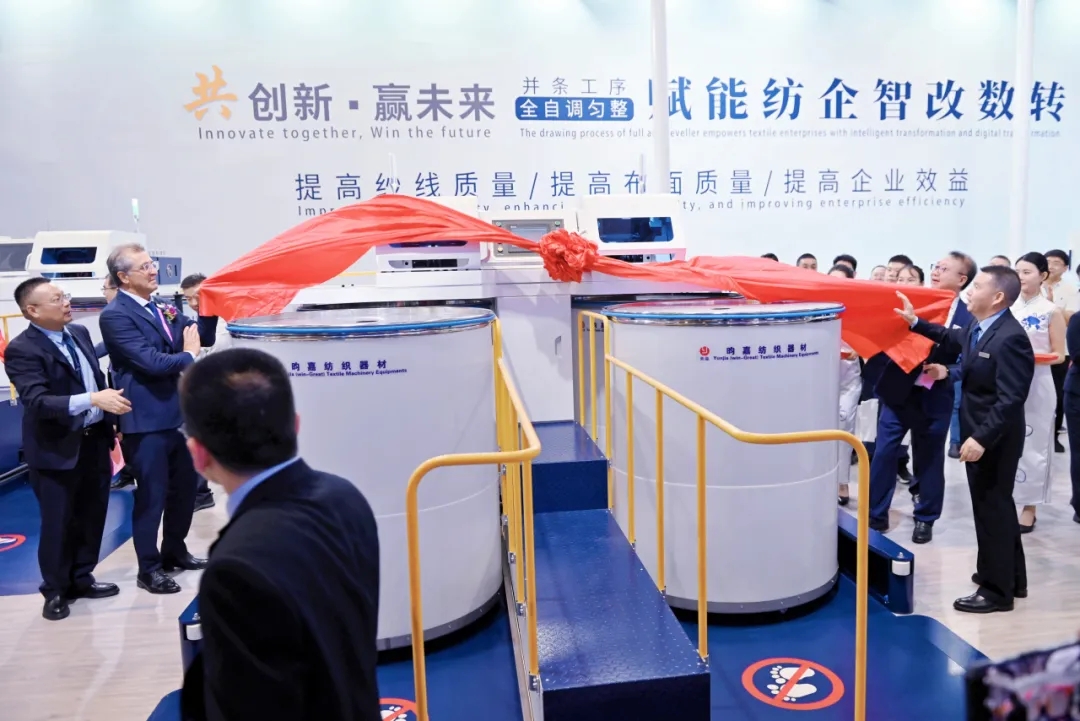 答謝會結(jié)束后,隨即舉行了新產(chǎn)品揭幕、開機儀式。天門紡機今年展出了TM23、TM27H、TM29H、TM35等四款型號的并條機。中國紡織工業(yè)聯(lián)合會孫瑞哲會長等行業(yè)領(lǐng)導(dǎo)、嘉賓一起為新產(chǎn)品揭幕,孫會長為展機啟動開機。